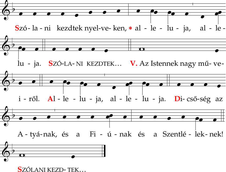 Mennyei kenyeret adott nekik * alleluja, alleluja. Mennyei kenyeret... V. (!!) Az angyalok kenyerét edte az ember. * alleluja... Dicsőség az Atyának + és a Fiúnak * és a Szentléleknek. * alleluja... Mennyei kenyeret...